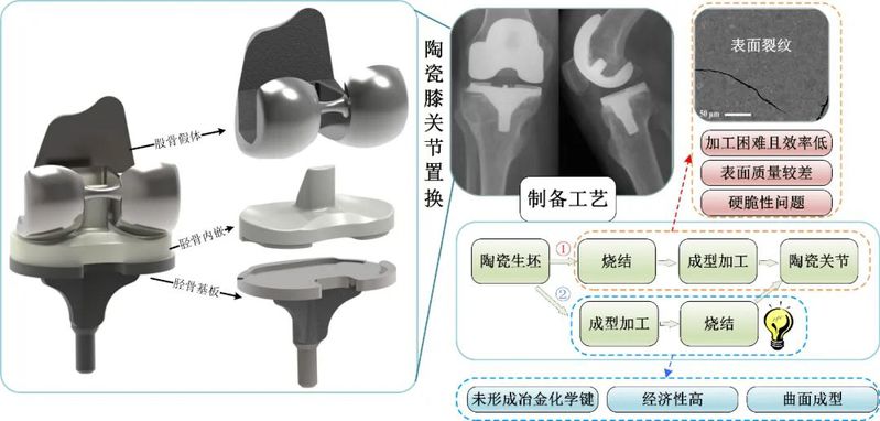 陶瓷全膝关节复杂曲面成型仍存在刀具磨损严重、加工表面损伤和加工效率低等问题,导致人工陶瓷膝关节等假体的应用和经济性受到限制。因此,面向复杂曲面陶瓷全膝关节的低损伤、高效成型加工一直是陶瓷人工关节应用领域的前沿热点和难点问题。目前,国内外研究人员提出可替代烧结陶瓷加工的陶瓷生坯加工技术,以“陶瓷生坯-成型加工-烧结陶瓷-精加工”新工艺为基础,成功提高了加工效率并降低了复杂曲面成型损伤。