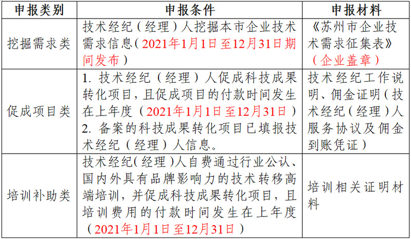 苏州市技术经纪(经理)人补助分为挖掘需求类、促成项目类和培训补助类三种。具体申报条件及申报材料如下表: