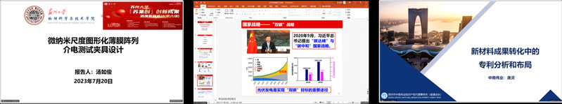 本次活动聚焦先进材料领域,邀请了来自苏州大学物理科学与技术学院、苏州大学光电科学与工程学院、苏州市中南伟业知识产权代理事务所的三位专家,围绕《微纳米尺度图形化薄膜阵列的介电测试夹具》、《全钙钛矿叠层太阳电池器件》、《新材料成果产业化中的专利分析与布局》进行了成果推介和专题讲解。