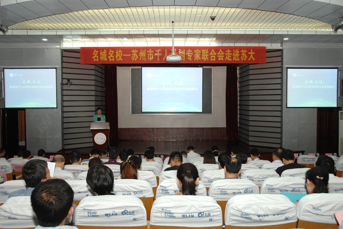 6月15日,“名城名校—千人计划专家联合会走进苏大”活动在校本部红楼学术报告厅举行。苏州市委常委、副市长吴庆文,我校校长熊思东,副校长路建美,市科学技术局局长张东驰,市科技局党组成员、科技服务中心主任赵玮芳,我校相关职能部门、学院(部)负责人,以及来自40余家高新科技企业的70余名苏州千人计划专家联合会成员参加了会议。会议由路建美主持。