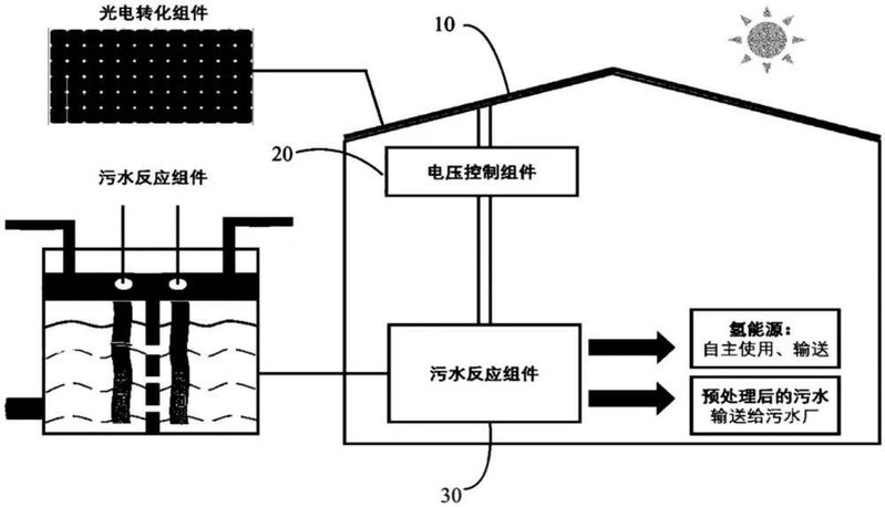 污水反应组件,与电压控制组件电性连接,污水反应组件包括反应槽、位于反应槽内的生活污水、与反应槽固定安装的支架、及第一电极和第二电极,第一电极用于产生活性基团并与有机物进行选择性反应,从而实现污染物的降解,第二电极用于通过还原反应进行制氢。